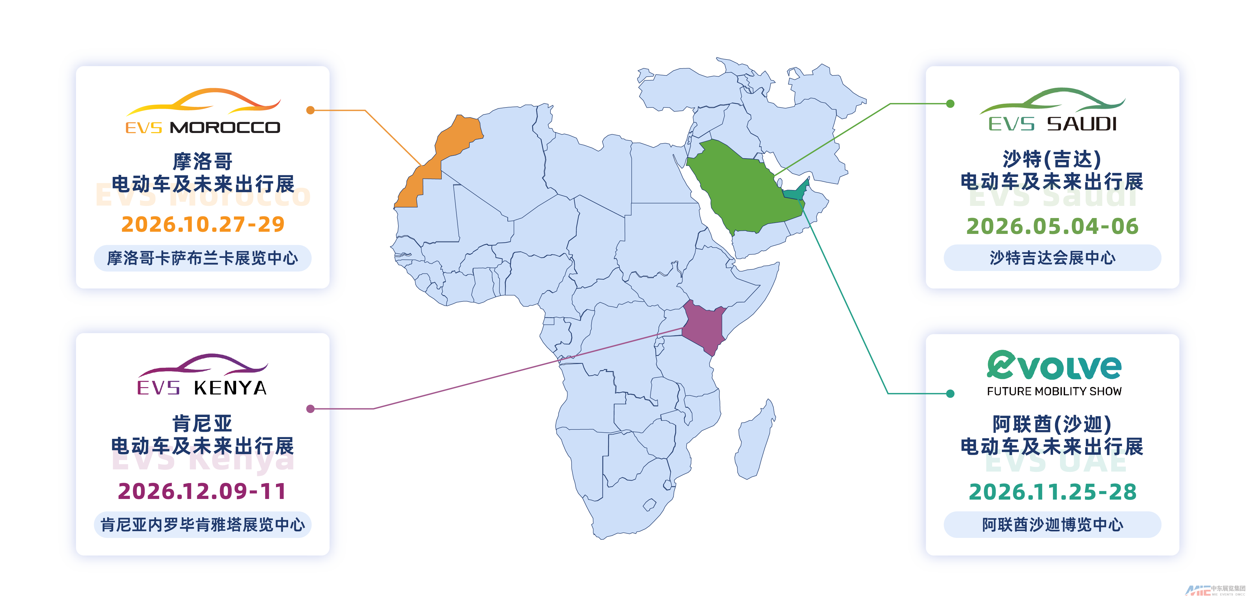 EVS未來(lái)出行展(EV & Mobility Show)是中東非洲地區(qū)聚焦未來(lái)出行方式的旗艦級(jí)盛會(huì),全面覆蓋電動(dòng)化、智能化、網(wǎng)聯(lián)化等核心領(lǐng)域。依托MIE集團(tuán)25年市場(chǎng)深耕經(jīng)驗(yàn),EVS已在沙特、阿聯(lián)酋、摩洛哥、肯尼亞成功舉辦,規(guī)劃電動(dòng)出行工具、能源基建、汽車后市場(chǎng)三大核心板塊,覆蓋完整產(chǎn)業(yè)鏈。