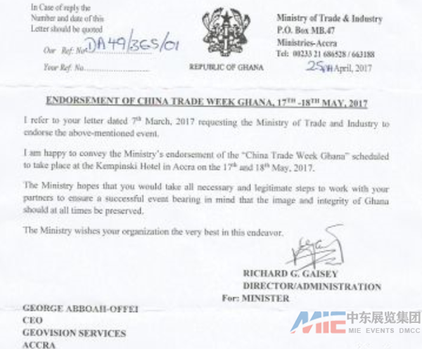 2017加納中國貿(mào)易周暨首屆西非采購商大會將于5月17日到18日在加納的首都阿克拉,凱賓斯基酒店如期舉行,此次展會得到了加納政府的大力支持:加納貿(mào)易部、加納貿(mào)工部、加納工業(yè)協(xié)會、加納工商業(yè)聯(lián)合會、加納投資促進中心、加納-中國友好協(xié)會和加納駐華大使館等。(附圖為加納貿(mào)工部發(fā)來的支持文件)