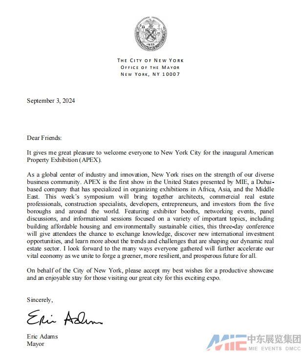 更值得一提的是,紐約市政府對APEX 2024給予了高度重視和熱烈支持。市長親自發(fā)來歡迎函,對即將舉辦的博覽會的舉辦表示誠摯的期待,并希望APEX 2024能夠為紐約市的房地產行業(yè)發(fā)展注入新的活力。